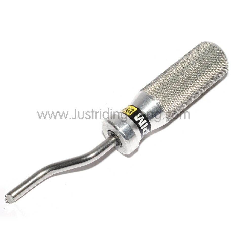 Slots into the head of spoke nipples and screws them onto the spoke – fast. Shape of head gauges when the spoke has been wound on and disengages.